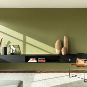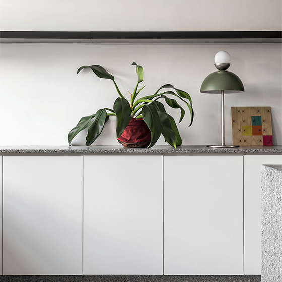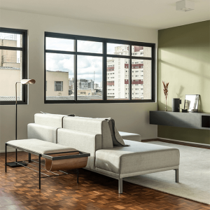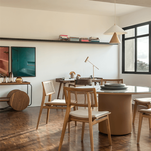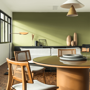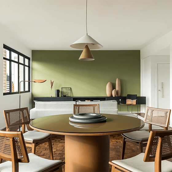 - Pontos de cor na sala de estar e cozinha – contraste com os móveis neutros trazendo um charme a mais