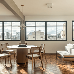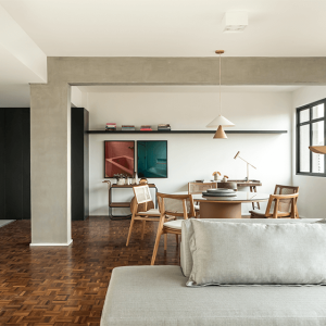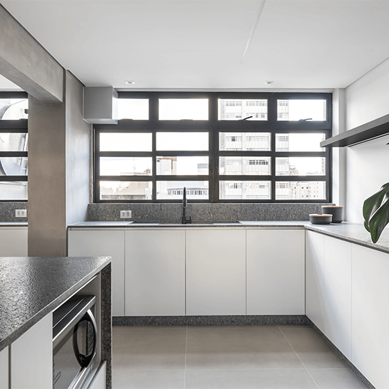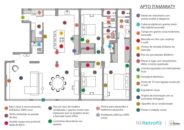 - Como o retrofit transformou esse apartamento?: Instalações elétricas e hidráulicas totalmente renovadas, Readequações de projeto para trazer mais amplitude e integração entre os ambientes, proporcionando mais conforto e funcionalidade, Novos revestimentos. Louças, metais, marcenaria, tampos em pedra, luminárias e portas