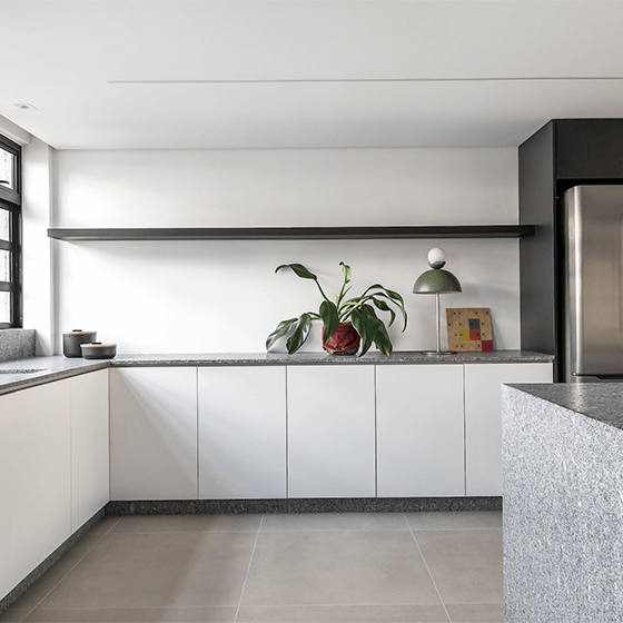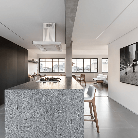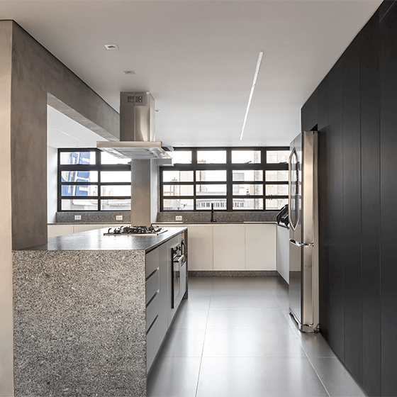 - Cozinha integrada à área social com ilha central e painel que esconde a porta de acesso ao corredor