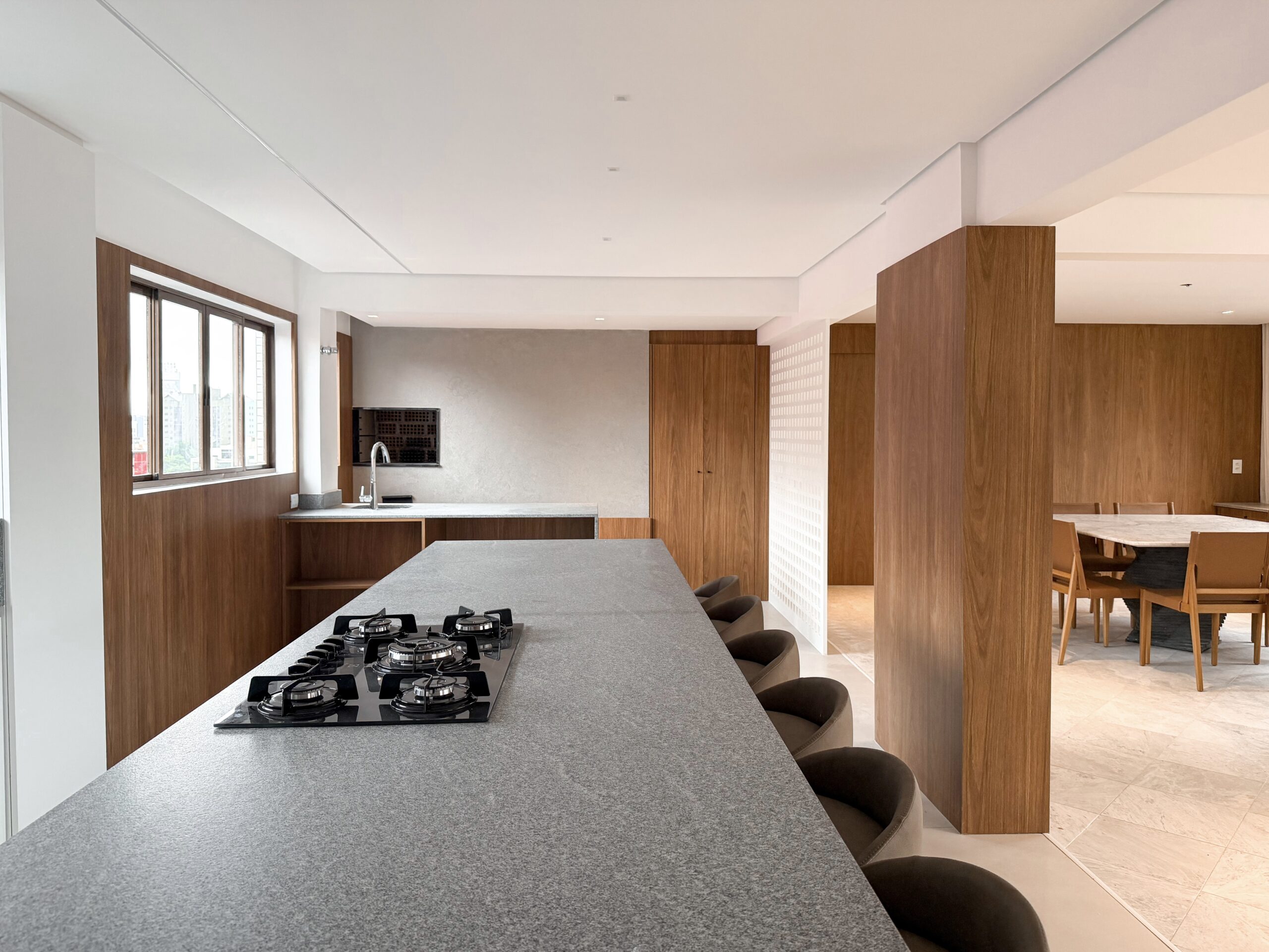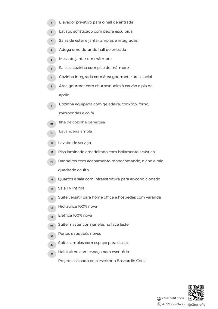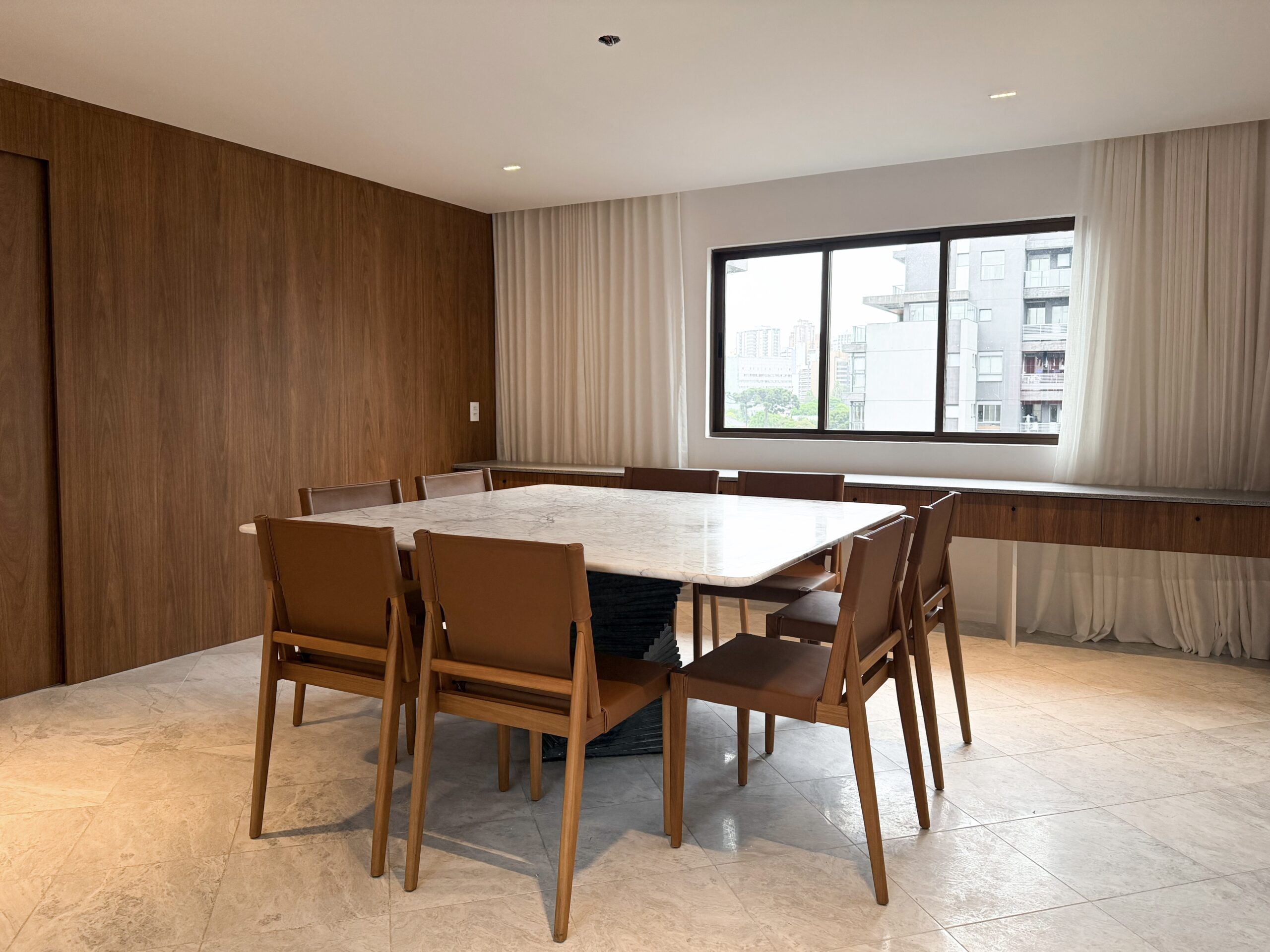 - Diferenciais: • 271 m² de área privativa • 8º andar • Face Leste/Oeste • Sala e cozinhas integradas • Semimobiliado (móveis fixos em áreas sociais e bwcs) • Churrasqueira à carvão • Hidráulica, Elétrica e Gás 100% refeitos • Infraestrutura para ar-condicionado • Projeto luminotécnico • 3 vagas de garagem