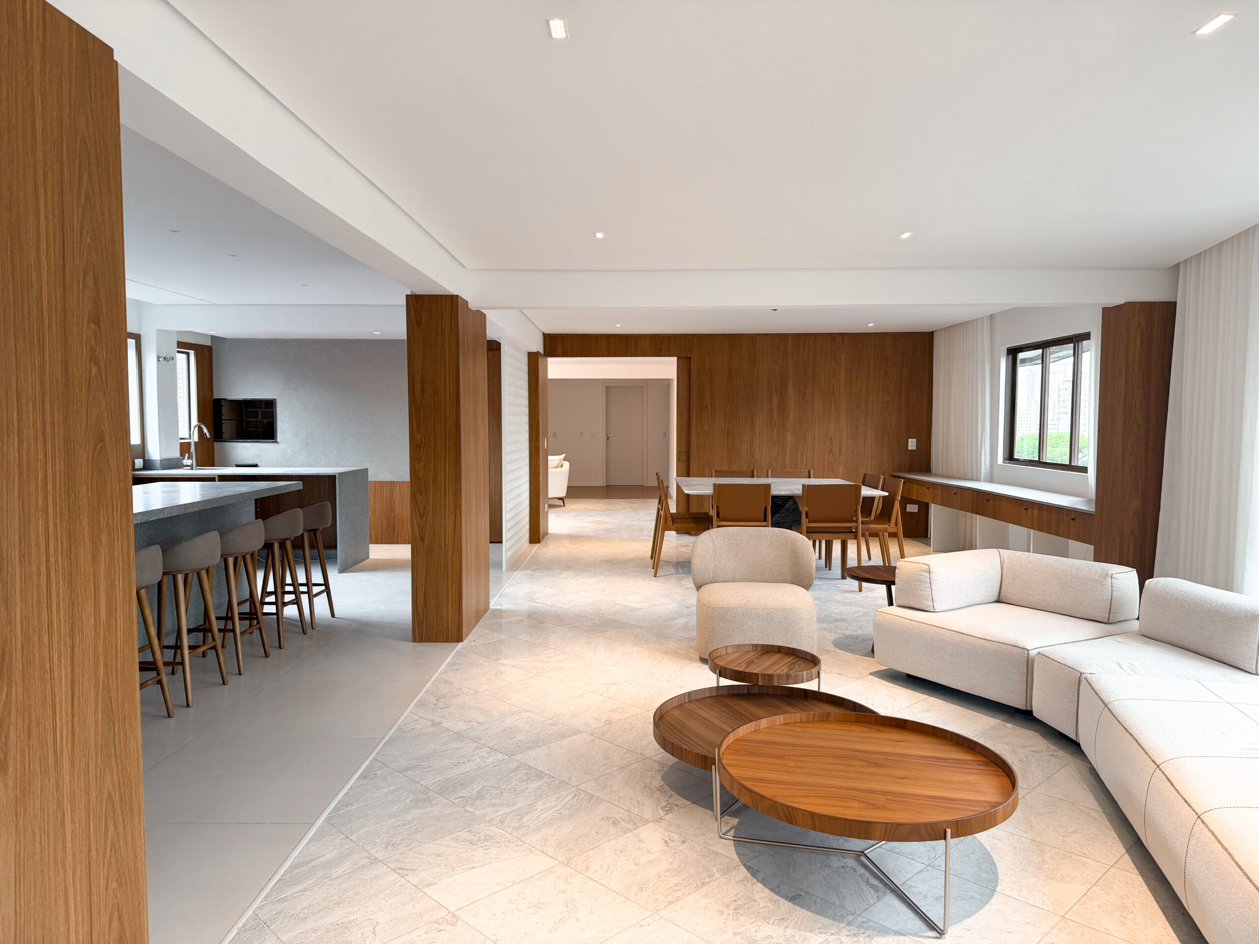 A área gourmet, com churrasqueira à carvão e pia de apoio, é ideal para momentos de lazer com amigos e familiares, enquanto a cozinha equipada com eletrodomésticos, que oferece funcionalidade e praticidade para o dia a dia. Pisos de mármore nas áreas sociais complementam o design sofisticado, harmonizando com uma mesa de jantar também em mármore. A suíte master, orientada para o leste, recebe luz natural ao amanhecer, proporcionando um ambiente acolhedor e tranquilo.