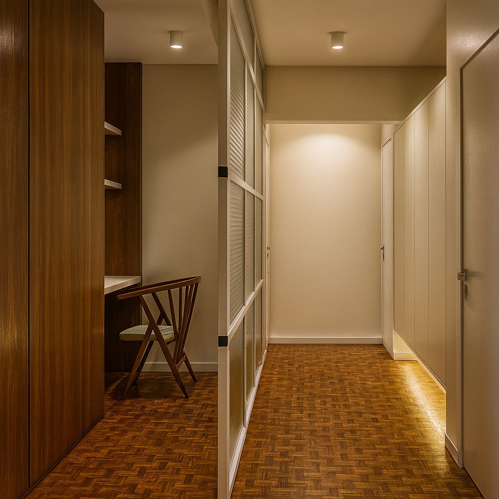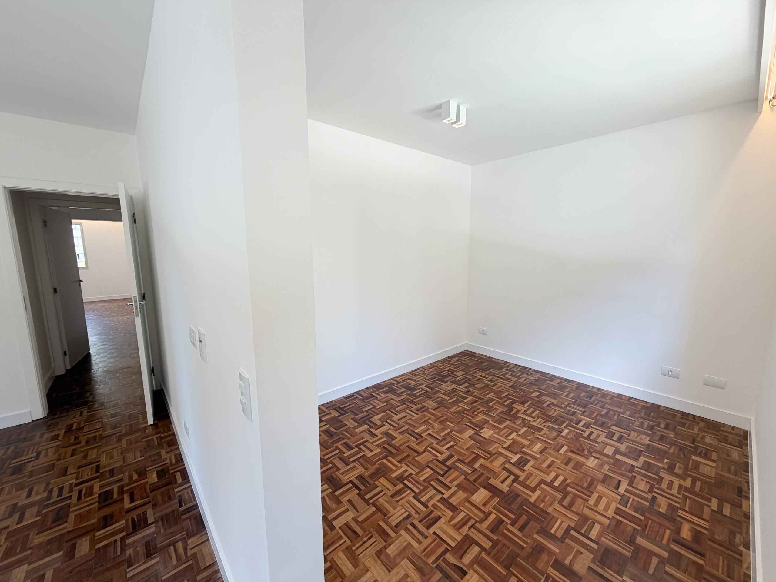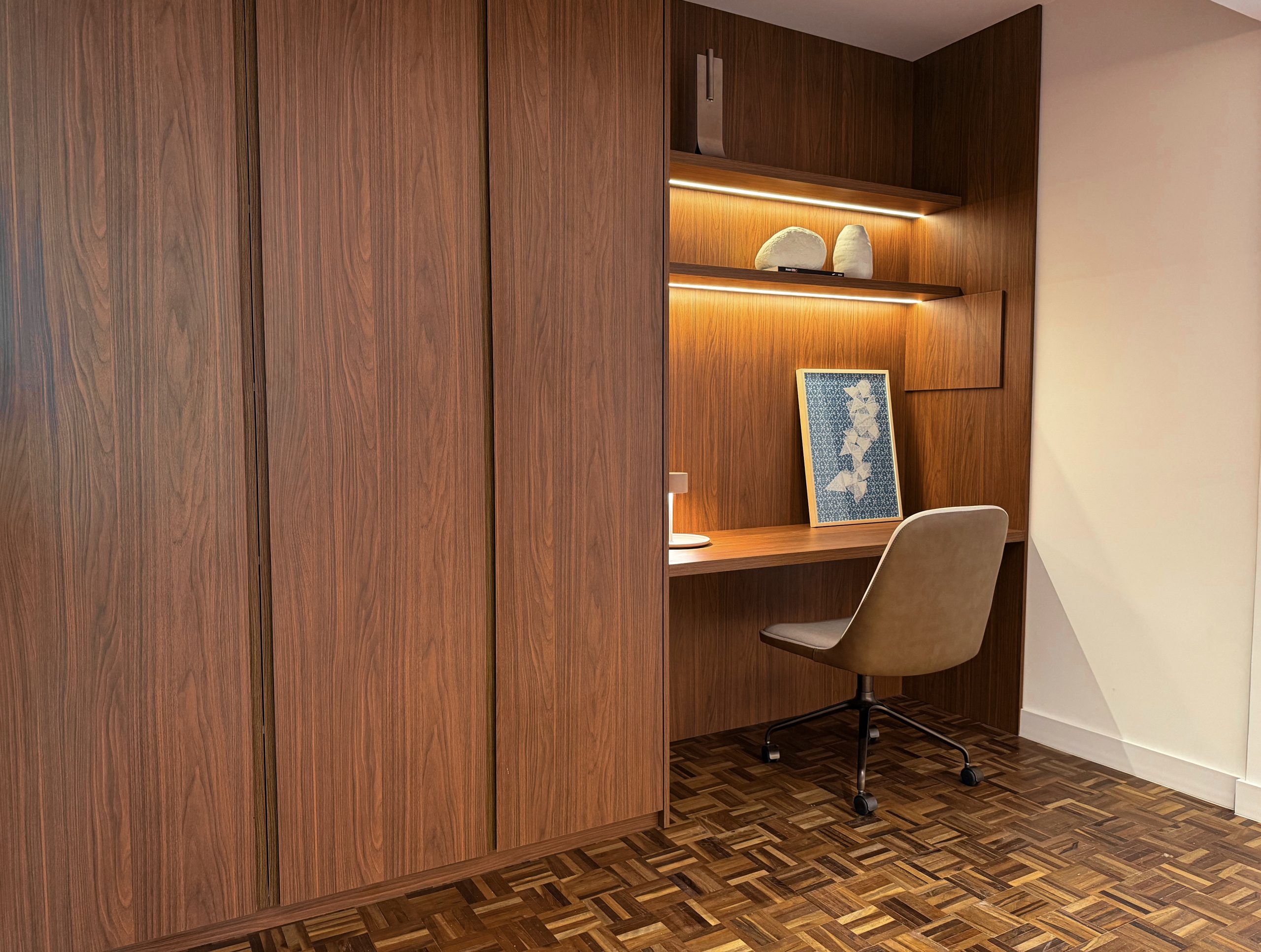 Na área íntima, o apartamento oferece 3 suítes, incluindo uma master com infraestrutura para ar-condicionado, além de um escritório reservado. O piso de taco revitalizado traz charme e aconchego, enquanto os banheiros receberam marmoraria, móveis planejados, louças, metais e boxes novos.