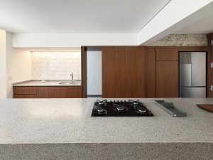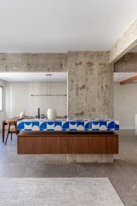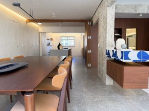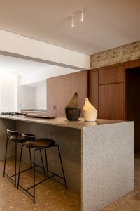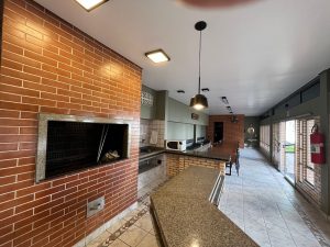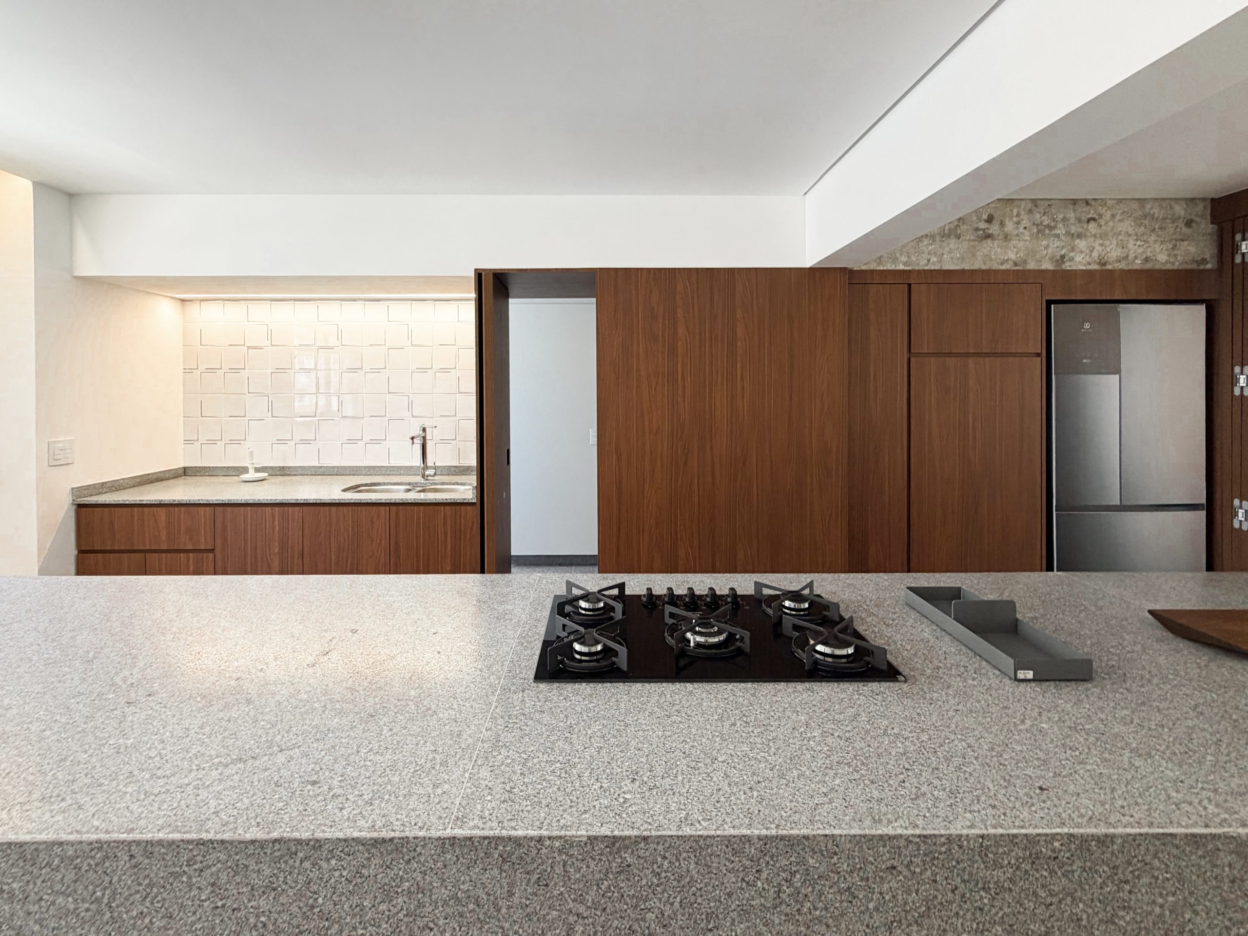 O projeto assinado pelo escritório BAUHA Arquitetura prioriza a integração dos ambientes sociais. Logo na entrada, sala de estar e jantar se conectam à cozinha, equipada com ilha central, marcenaria planejada, marmoraria, cooktop novo e espaço para churrasqueira gourmet — ideal para receber. Toda a área social conta com novos revestimentos e marcenaria sob medida, além de um lavabo.