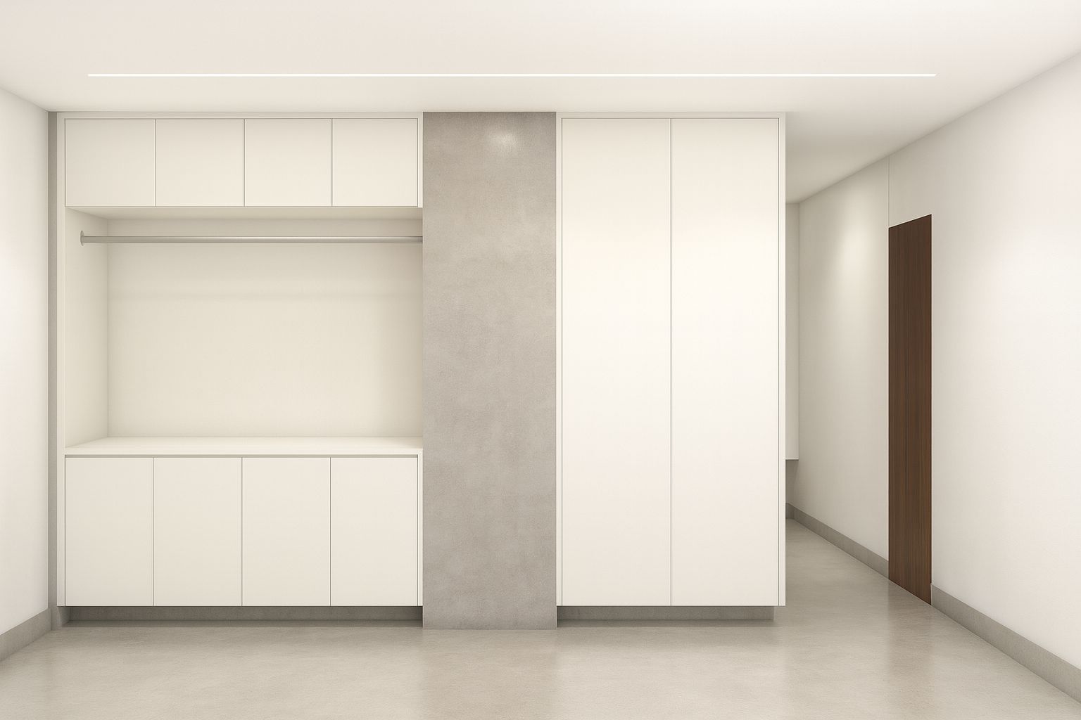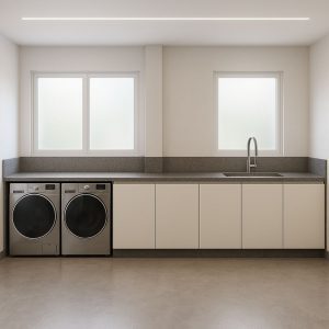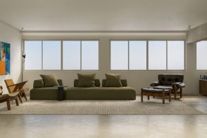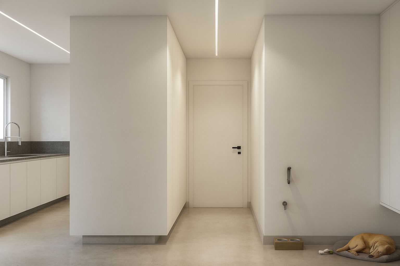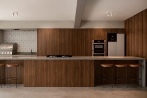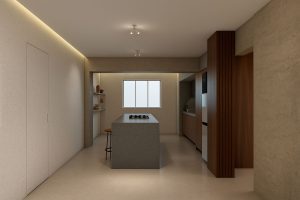 O projeto assinado pelo escritório BAUHA Arquitetura prioriza a integração dos ambientes sociais. Logo na entrada, sala de estar e jantar se conectam à cozinha, equipada com ilha central, marcenaria planejada, marmoraria, eletrodomésticos novos e churrasqueira americana integrada à área gourmet — ideal para receber. Toda a área social conta com novos revestimentos e marcenaria sob medida, além de um lavabo.