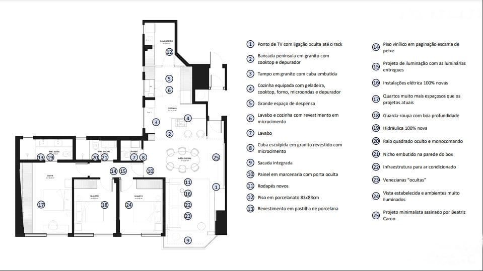 - Diferenciais: • Semimobiliado • 16ª andar • Face Norte • 3 quartos, sendo 1 suíte • Sala e cozinhas integradas • Cozinha com armários e eletros e ilha em granito • Estrutura para ar-condicionado para sala e suíte • Lavabo • Sala e sacada integradas • Piso vinílico e porcelanato nas áreas frias • Lavanderia com armários • Estrutura para ar-condicionado na sala e nos quartos